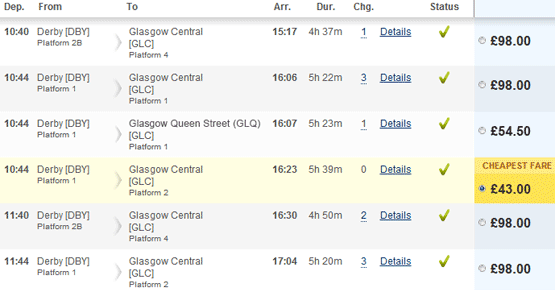 We were worried about the possibility of missing one of the three connections so we looked again and found an alternative train departing Derby at 10:44, changing once at Haymarket and costing £54.50 each. This is the same train from Derby and would see us arrive into Glasgow just one minute later than the first option.