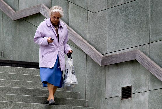A grandma shows how to text whilst negotiating concrete steps.