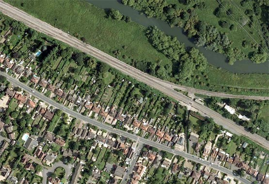 An aerial view of Kennington Junction, with Down trains travelling from bottom-right to top-left.