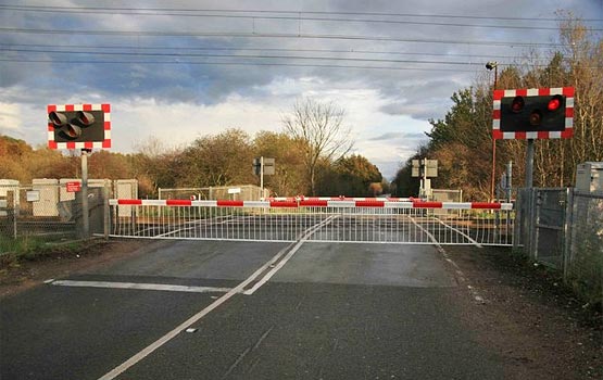 Torworth level crossing - lights flashing, barriers down.