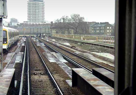 As they approach the Victoria terminus, the Chathams - on the eastern side of the formation - come together with the Brighton lines to create a nine-track railway across the Thames. Alongside them, a disused trackbed forms a handy cess. On reaching the river’s northern bank, the railway immediately crosses Grosvenor Road on a separate structure. Here, the spaces between the tracks are occupied by pairs of 1.1m-high parapets.
